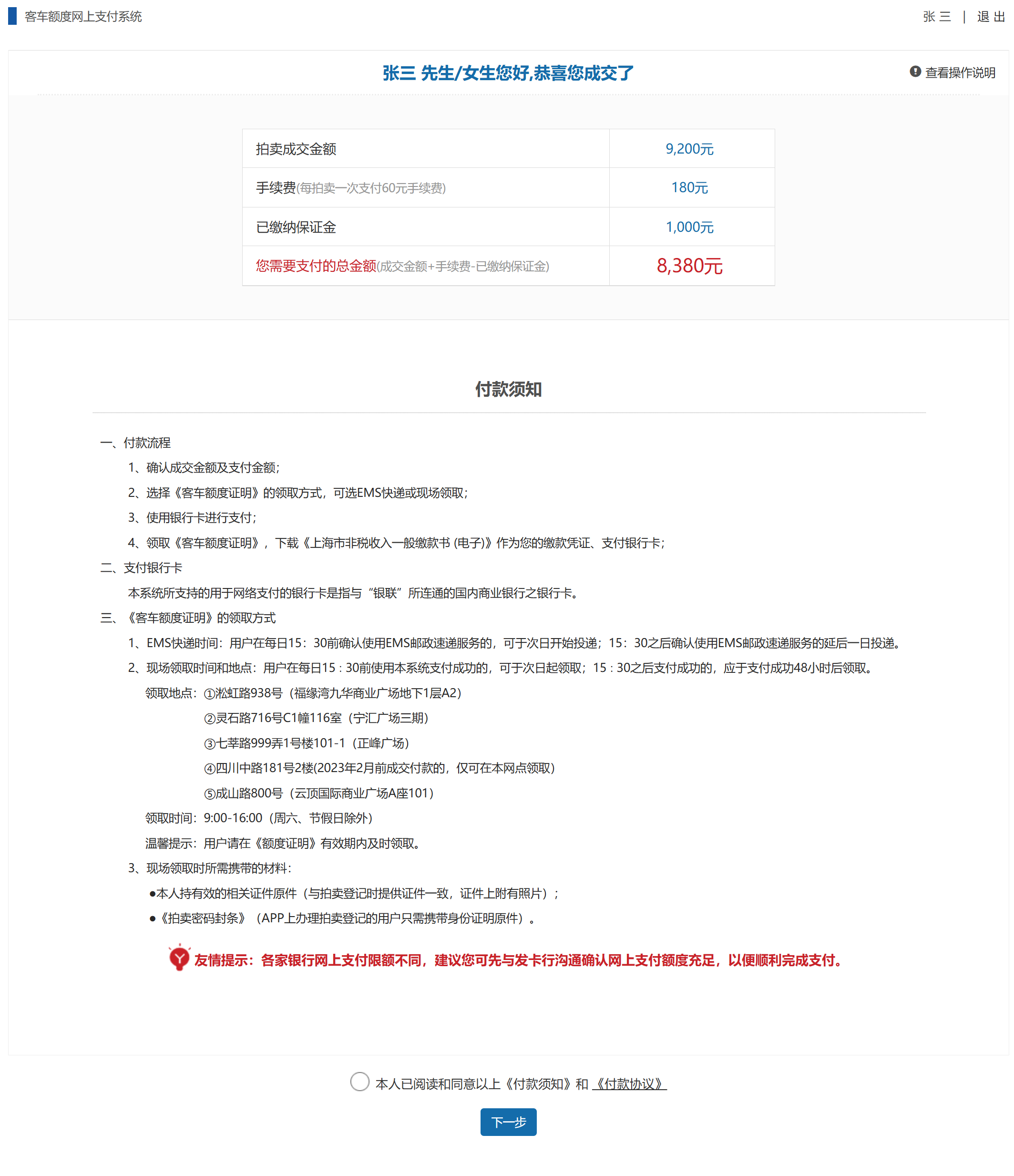 阅读《付款须知》和《付款协议》后点击下一步