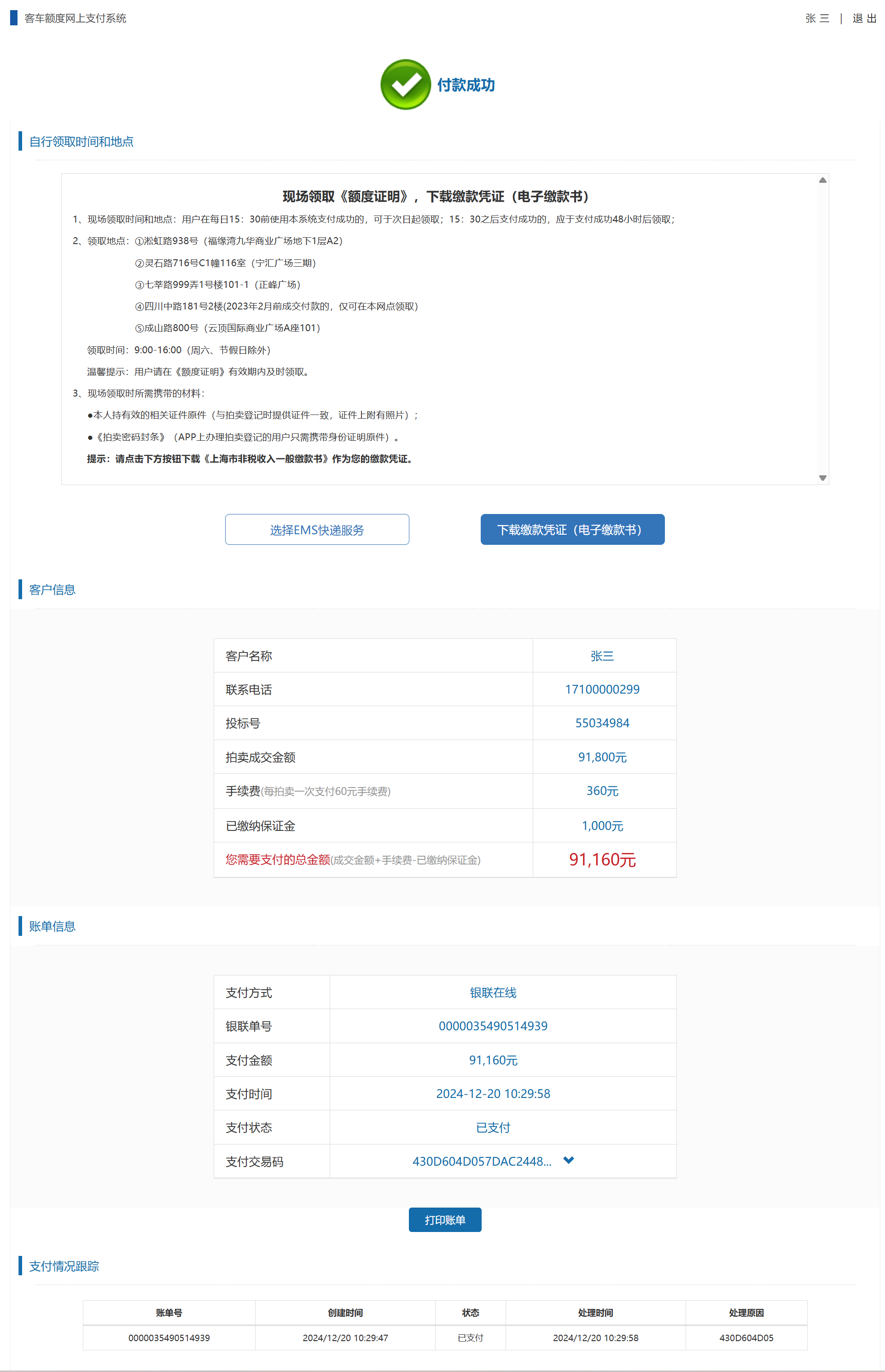 4. 根据系统内展示的领取时间和方式领取《客车额度证明》,下载电子缴款书作为您的缴款凭证。